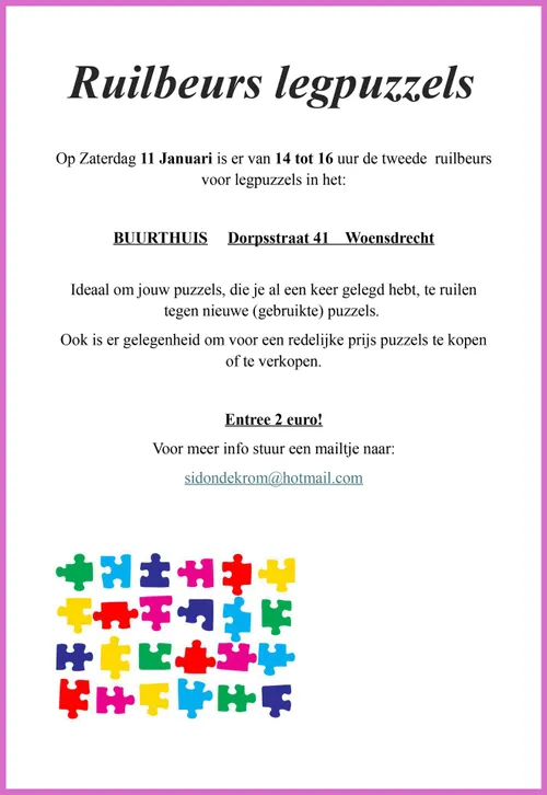 uur de tweede ruilbeurs voor legpuzzels in het Buurthuis aan de Dorpsstraat 41 in Woensdrecht.