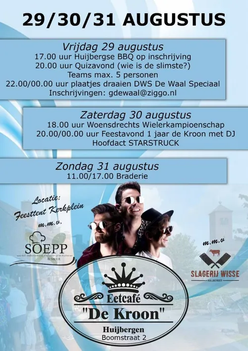 - Na het Woensdrechts Wielerkampioenschap start in de feesttent de viering van 100 jaar Eetcafé De Kroon met DJ en hoofdact Starstruck. Dit feest zal tot middernacht doorgaan. De toegang is gratis.