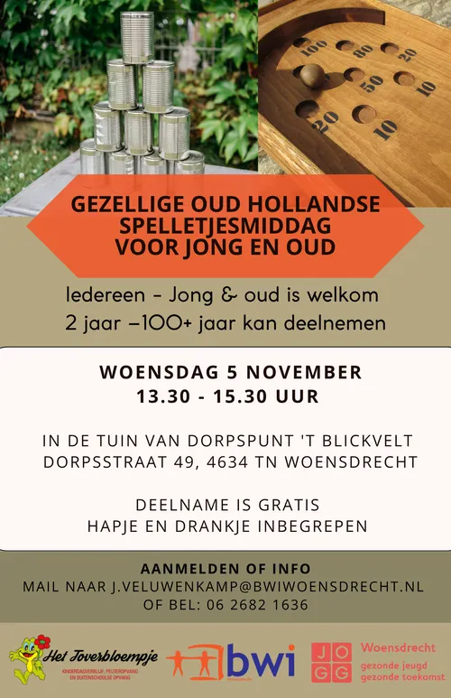 Op woensdag 5 november organiseert de BWI, in samenwerking met Het Toverbloempje en JOGG Woensdrecht, een Oud Hollandse spelletjesmiddag in de tuin achter Dorpspunt 't Blickvelt.