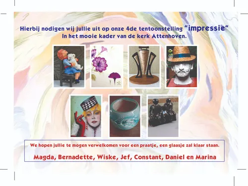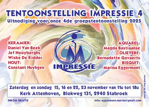 Beleef de veelzijdigheid van kunst tijdens Tentoonstelling Impressie 4, een unieke expositie die voor de 4de keer plaatsvindt op zaterdag 15 en 22 november en zondag 16 en 23 november.