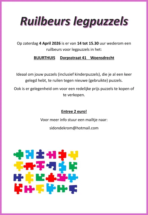 Op zaterdag 4 April is er van 14:00 tot 15:30 uur wederom een ruilbeurs voor legpuzzels in het Buurthuis aan Dorpsstraat 41 in Woensdrecht.