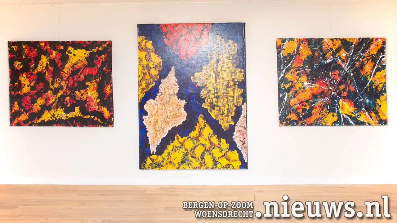 Helemaal tegen de achterwand van de galerie hangen de werken van Henk. Henk schildert intuïtief, waarbij de compositie de betekenis geeft aan het werk. Het werk beeld niets uit maar is puur een abstracte compositie.