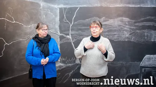 Zodra je de galerie binnenstapt zie je aan de linkerkant aan de wand krijttekening van vierentwintig vierkante meter van Jodrike en Trudie. Al lang hadden Jodrike en Trudie al het idee om wat leuks te doen met de grote zwarte zijwand van de galerie en nu is het er dus van gekomen. het kunstwerk zal een maand bestaan, waarna het met een emmer water en een spons weer voor altijd zal verdwijnen.
