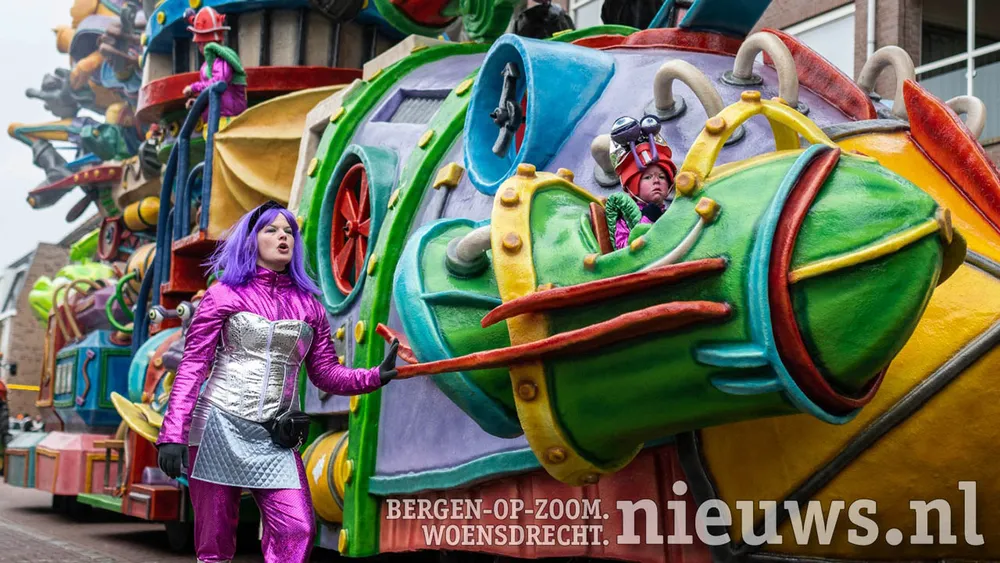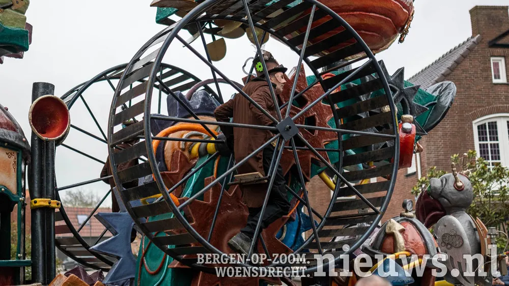 De praalwagen met het steampunk-thema was één van de vijftien wagens die meereed in de optocht. Klik hierboven op de foto om de hele fotoserie te bekijken die een samenvatting geeft van de carnavalsoptocht in elf foto's.