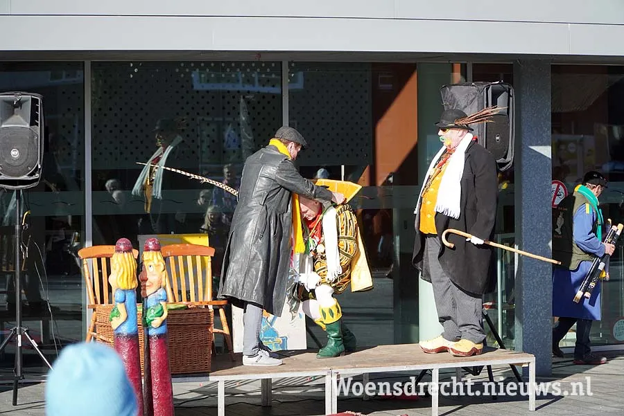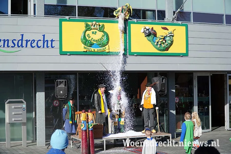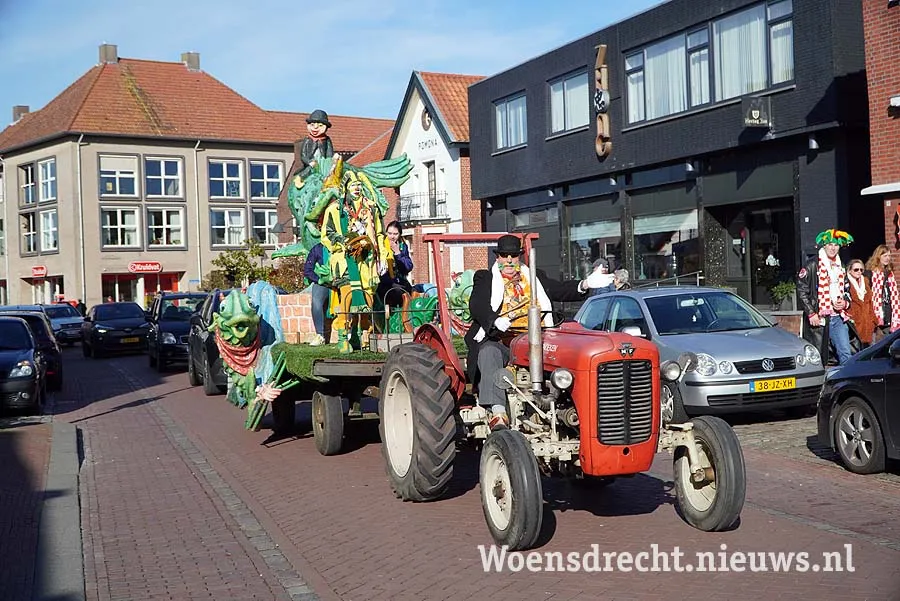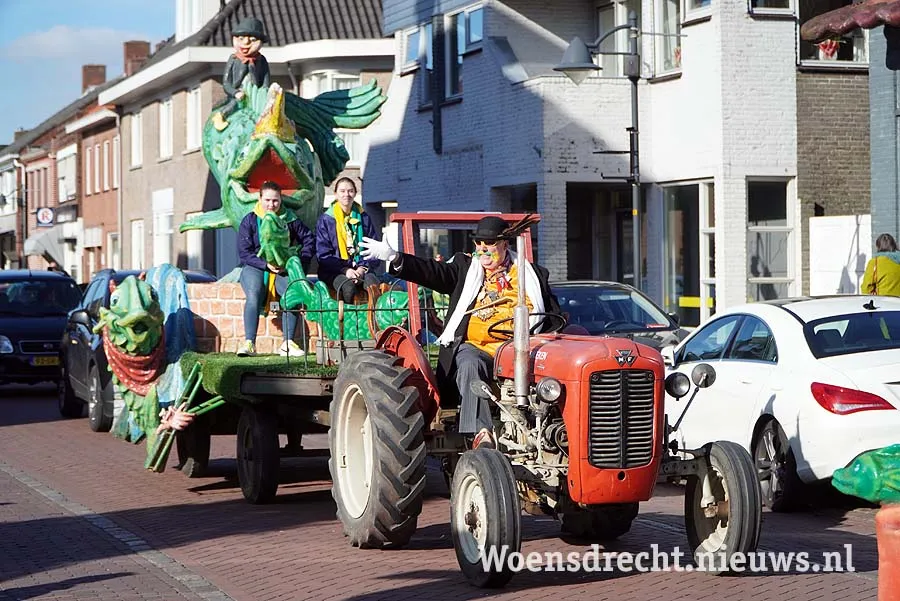 Tientallen feestvierders hadden zich op het plein voor het gemeentehuis verzameld om de bescheiden stoet op te wachten. Achter de prinsenwagen reden het treintje van Sjees Openbare Feestelijkheiden, en de trekker van de Grootste Boer met daarop de snoek en de nar.