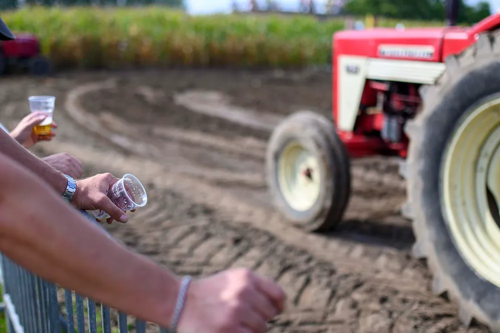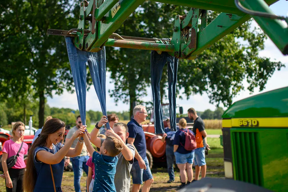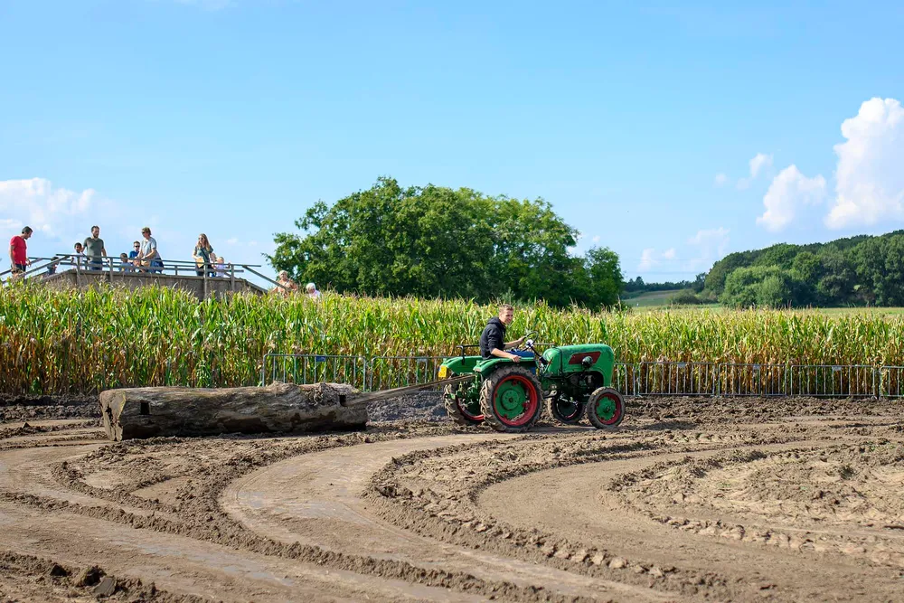 Leden van de historische tractoren en machineclub (tmc) ploegden en sleepten heel wat af aan de andere kant van het perceel. Met boomstammen en betonblokken werden krachtmeting gedaan. Dat ging gepaard met brullende tractormotoren en blauwe pluimen rook. Wie dat wilde kon zelfs een rondje op de kar achter een trekker meerijden.