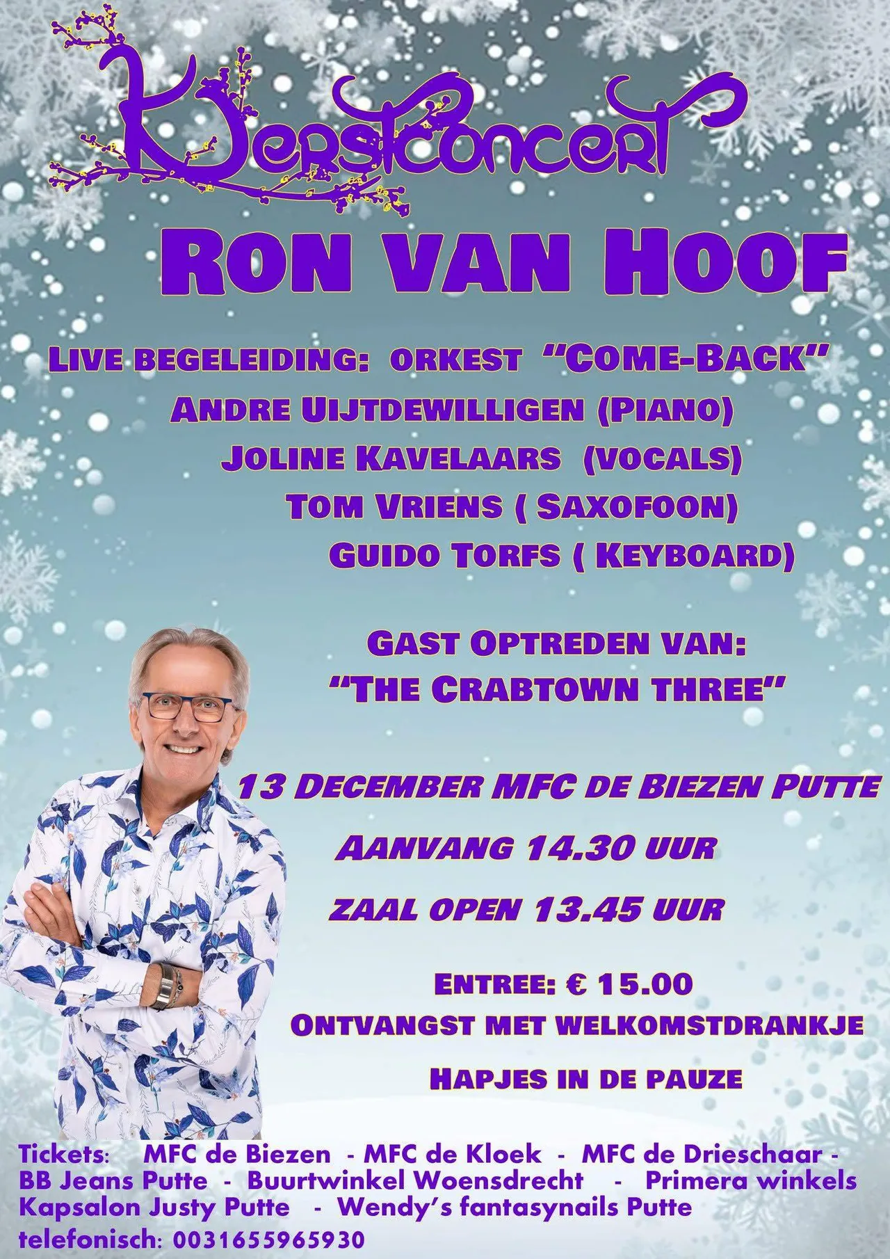 Zaterdag 13 december houdt Ron van Hoof al weer voor de vierde keer een Kerstconcert in MFC De Biezen in Putte.