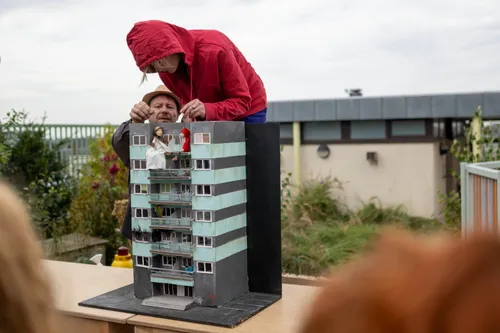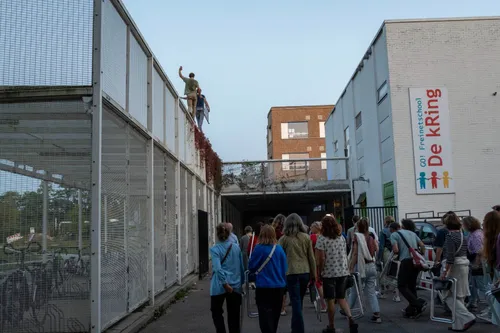 Door de beperkte buitenruimte heeft de Hibernia Steinerschool een schoolplein op het dak. Stef De Paepe en Kaat Arnaert voerden hier hun ontroerende poppen-voorstelling Meisje met de rode hoodie op. Een antisprookje over rouwen dat licht en humoristisch van spreektoon is maar diepzinnig en filosofisch van ondertoon.