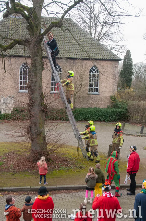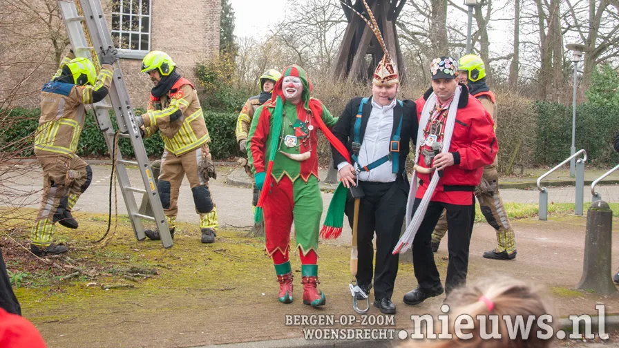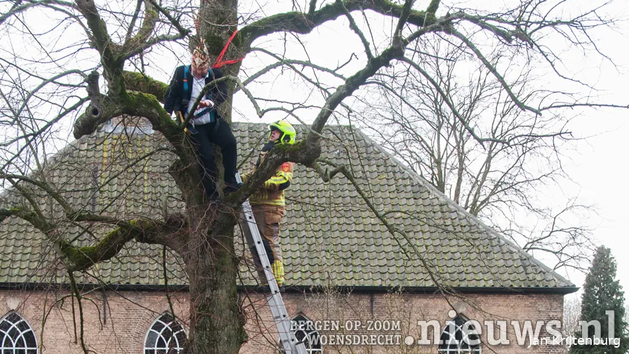 Met de lange ladder en de deskundige hulp van de brandweer werd prins Zjim snel uit de boom bevrijd.