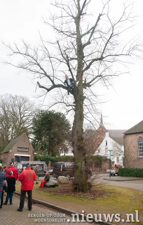Een van de kinderen die meeliep vertelde dat hij prins Zjim in de buurt van het pinapparaat bij het oude gemeentehuis had gezien dus daar ging de stoet nu heen en inderdaad, daar was prins Zjim. Alleen niet bij de pinautomaat maar hoog in de boom.