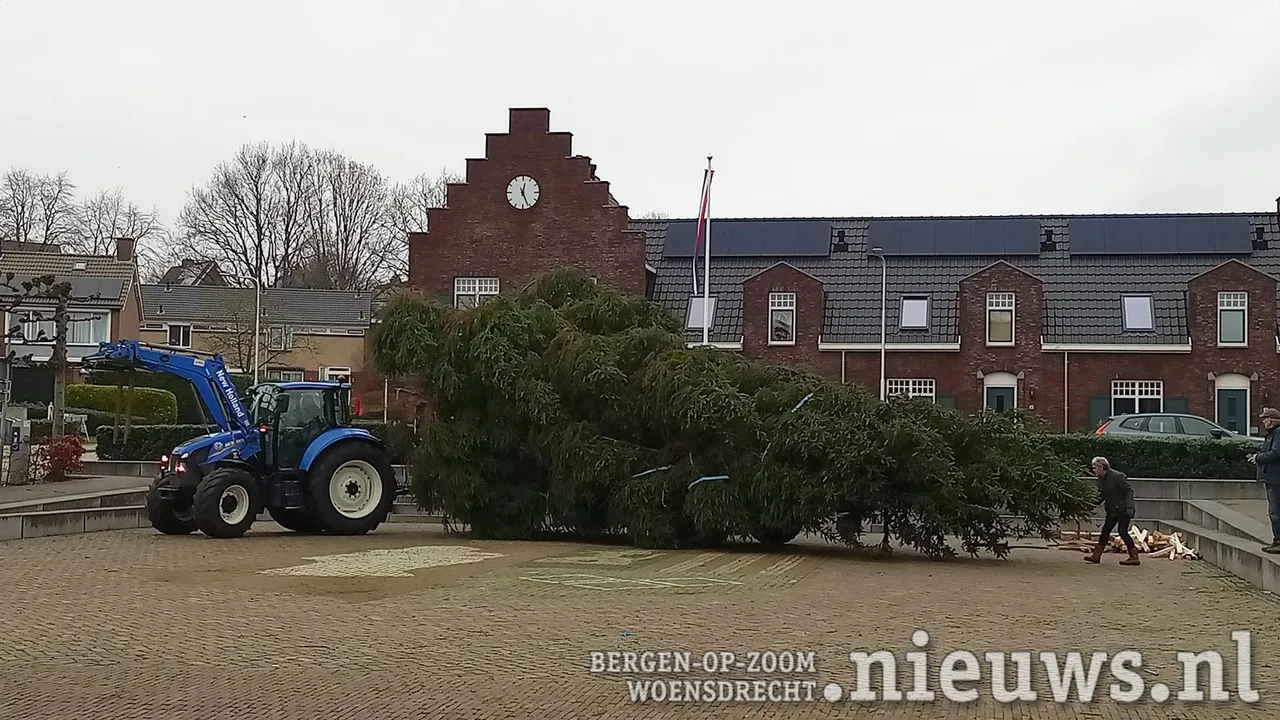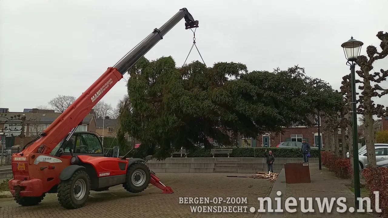 Op een aanhanger achter een trekker werd de boom naar het plein gebracht waar hij met behulp van een kraan en veel mankracht op zijn plek gezet en stevig verankerd werd.
