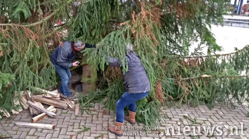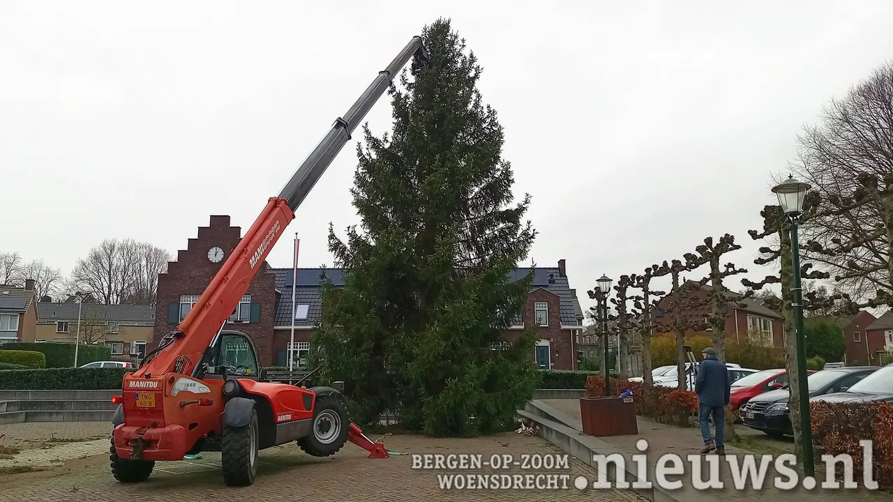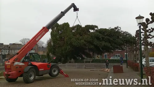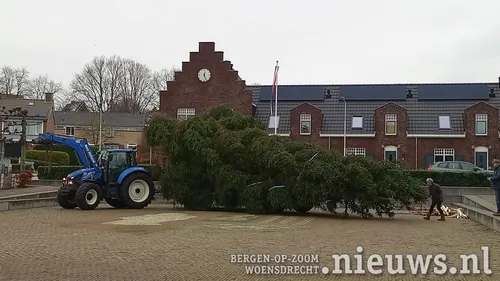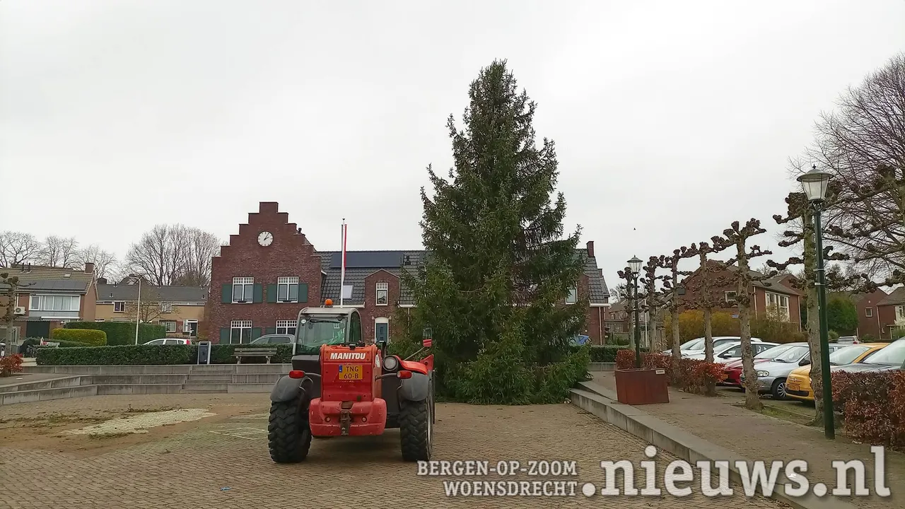 Vrijdagmiddag werd door de vrijwilligers van het dorpsplatform Woensdrecht traditiegetrouw op het Col. Whitakerplein de kerstboom neergezet.