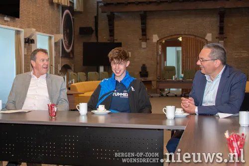 Samen met zijn ouders, zijn broer Thimo en de trainers werd Tom in de raadszaal van het gemeentehuis met een kopje koffie en een gebakje ontvangen door burgemeester Adriaansen en wethouder van sportzaken Schuurbiers.